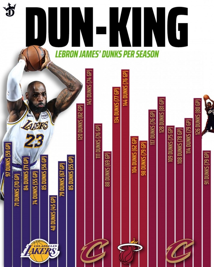 江南体育全站-詹姆斯生涯各季扣篮数:本赛季97扣湖人生涯新高 生涯最高为145扣